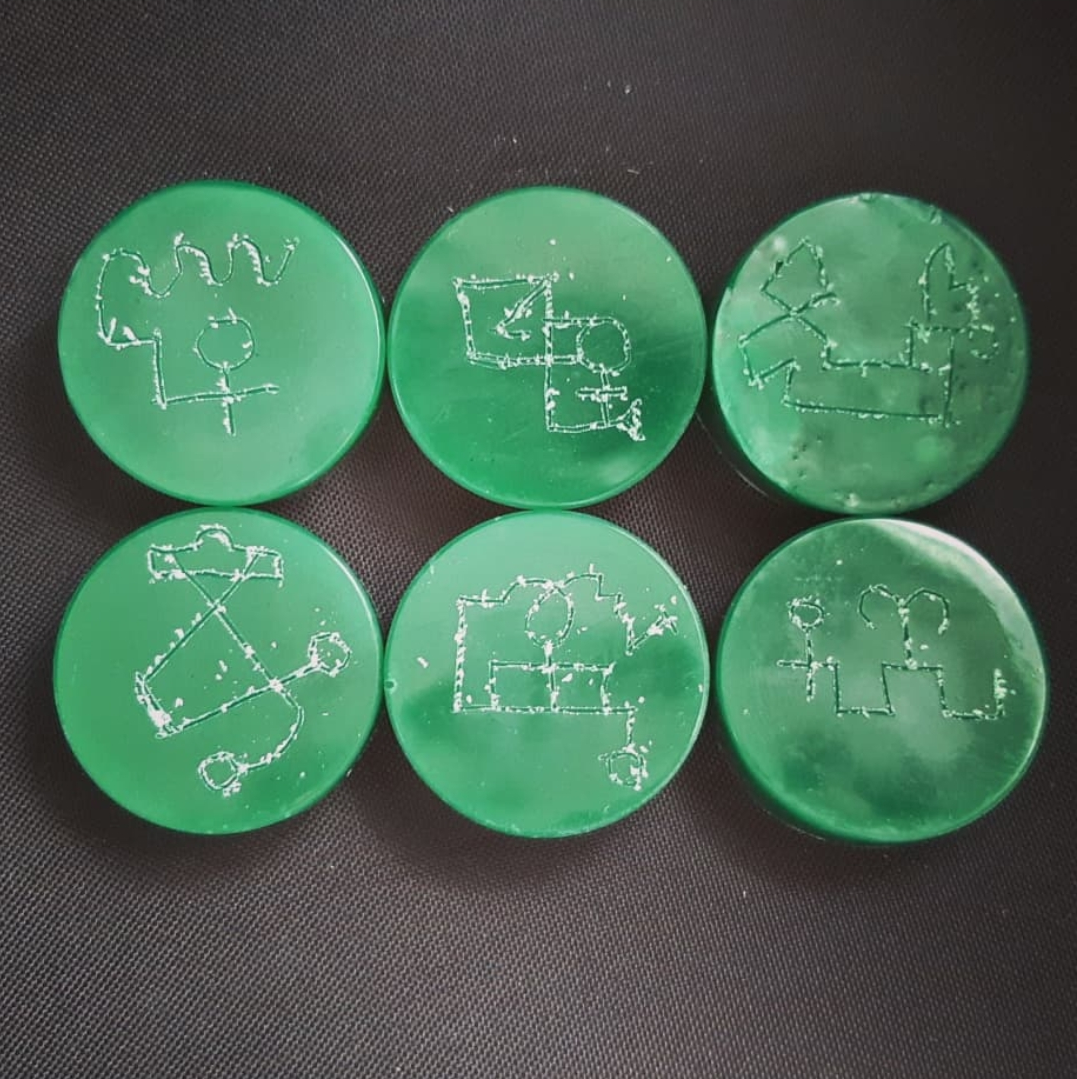 The spirits that govern this oil were called upon through the microcosm of a hexagram encoded with the characters of the sun drawn on the floor with chalk, also derived from the same Faustian text. With a light lit at each corner of its hexagram, they were called into the mother bottle to pray over, charge, and attest to the potency of each vivified ingredient. The oil itself was built brick by brick, through herbal, mineral, and animal powders prepared independently and blessed for each of the named functions of the Prayer to Helios. Powders of conquest against enemies were blended with seeds that germinate and celebrate victory alongside seen and unseen allies alike, then unified through a Greco-Egyptian solar powder that brings peace through unyielding strength and the force of regency. Once composed, the final powder was bound in local honey, and finally brought together with very good quality olive oil. The bottle, already humming with spirit activity, was prayed over using the Prayer of Helios, Consecration for all Purposes, and a selection of spirit-derived oral charms and petitions taught to me directly by my solar familiars.