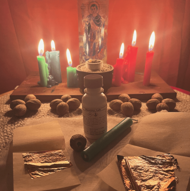 An oil built at the guiding hand of St. Expedite over many years and just as many iterations, bringing about countless successful workings, manifestations, and results for both myself and others along the way. This edition of the oil serves as a distilled offering to the Saint himself, primarily stirring him and his legions to action and guiding his virtues and sympathies into workings under his auspices. I recommend applying seven drops to the right foot of an image of St. Expedite upon the reception of this oil in order to complete a final personalized consecration. Cinnamon bark, cinquefoil, coconut flesh, coffee beans, dice, eucalyptus, lemongrass, blessed palm fronds from a Catholic church, crumbs from multiple pound cakes offered to St. Expedite in exchange for successful workings in his name, roses fed holy water from three different Catholic churches and offered to St. Expedite on Easter, whole vanilla beans, wintergreen leaves, skeleton keys, scraps of cloth from a cape that adorned a statue of St. Expedite, dirt from various shrines to St. Expedite, gold, silver, a carrier oil kept and fed on St. Expedite’s shrine for one year from feast to feast, and additional vegetable, animal, and mineral components. 1 fluid ounce / 30 milliliter amber glass dropper bottle. Price includes shipping. Created by B. Key.